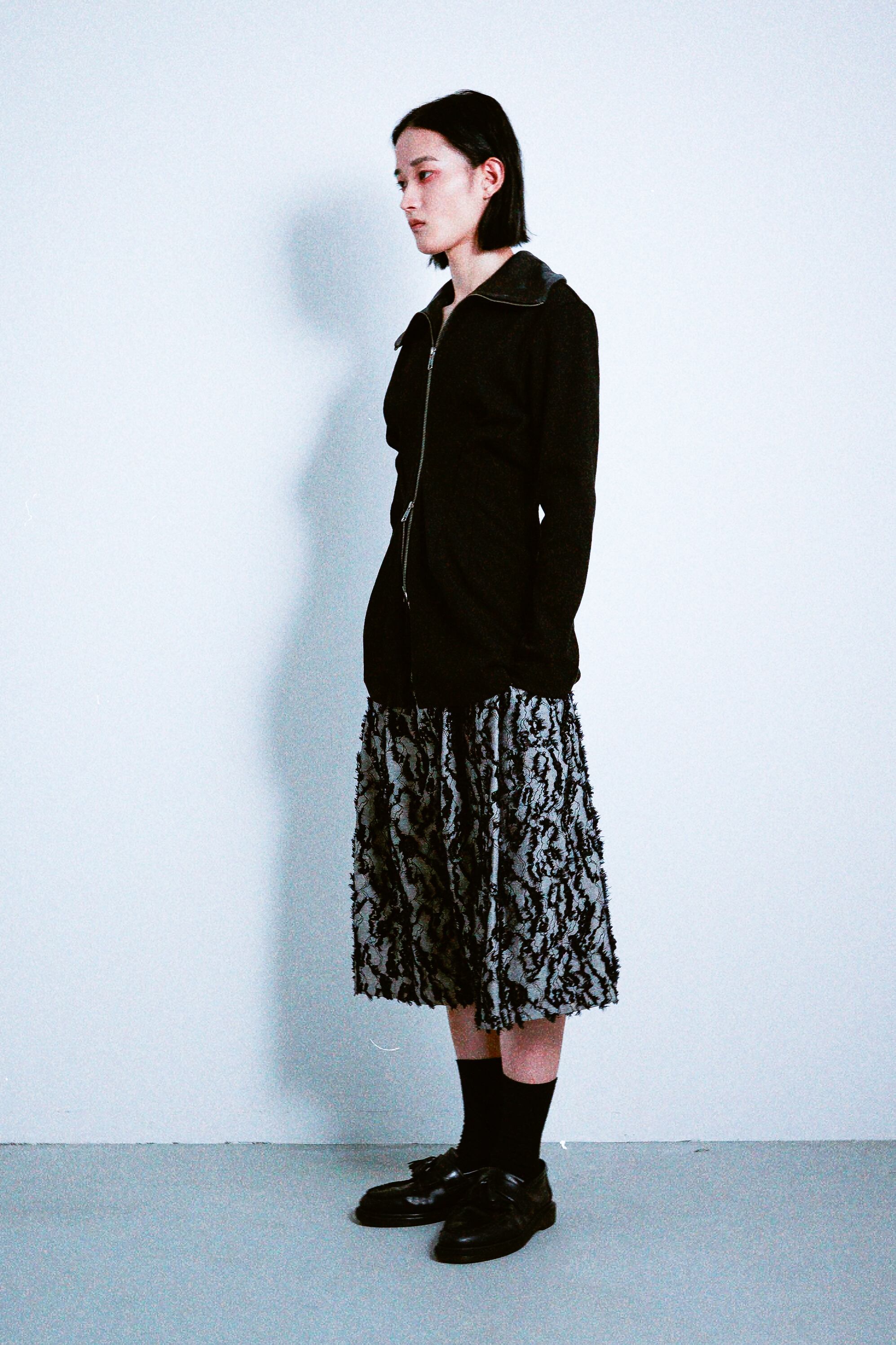 ニット素材と折り返しの衿によって再構築しました。